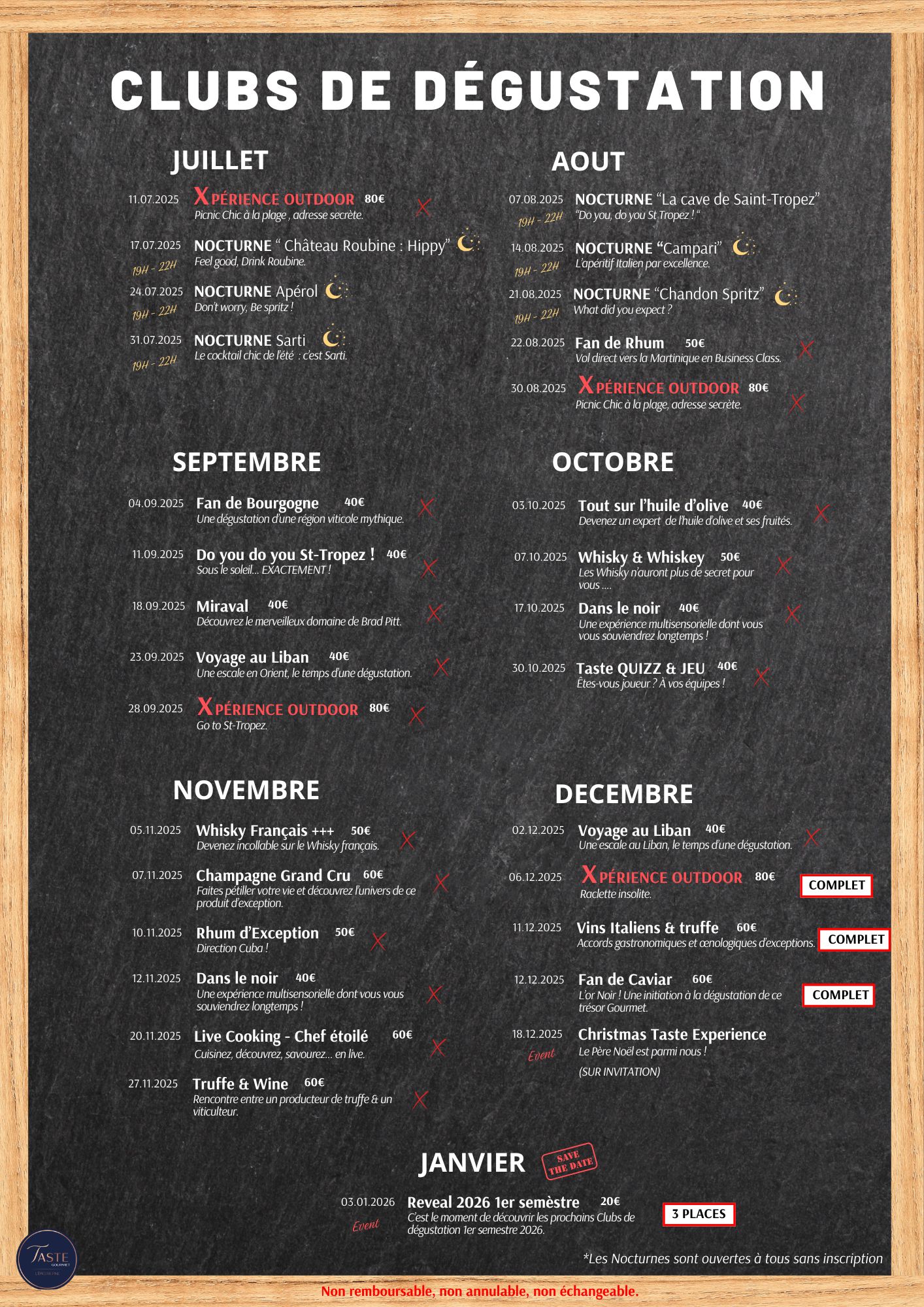 Taste Gourmet, c'est aussi un Club de Dégustation animé par des experts, des Chefs, des producteurs, des personnalités, des Artistes. Au rendez-vous, des formations, de l'initiation, de la dégustation de produits d'exception, des ventes très privées et des rencontres extraordinaires. Renseignements : Durée : Environ 2H00 Capacité du Club : 10 participants (sauf événements). 04 94 54 62 69 contact@taste-gourmet.fr