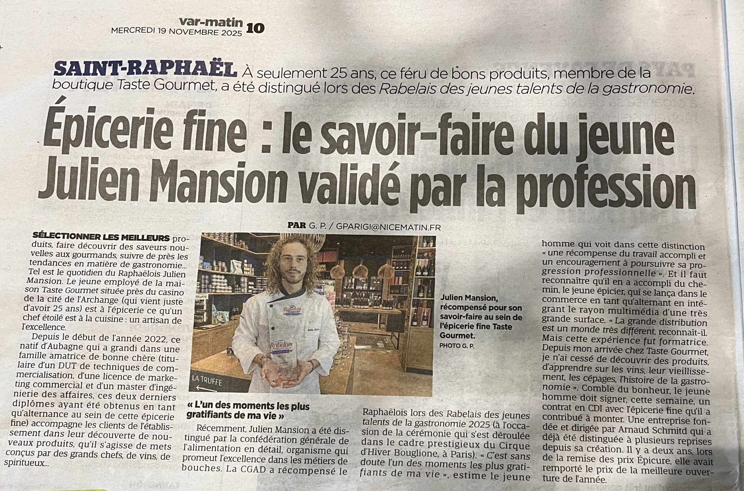 L’avenir de la gastronomie française s’écrit aussi sur la Côte d’Azur. Julien Mansion, 25 ans, apprenti depuis trois ans chez Taste Gourmet à Saint-Raphaël, vient d’être distingué lors de la 13ᵉ promotion des Rabelais des Jeunes Talents de la Gastronomie, organisée dans le cadre prestigieux du Cirque d’Hiver Bouglione à Paris.