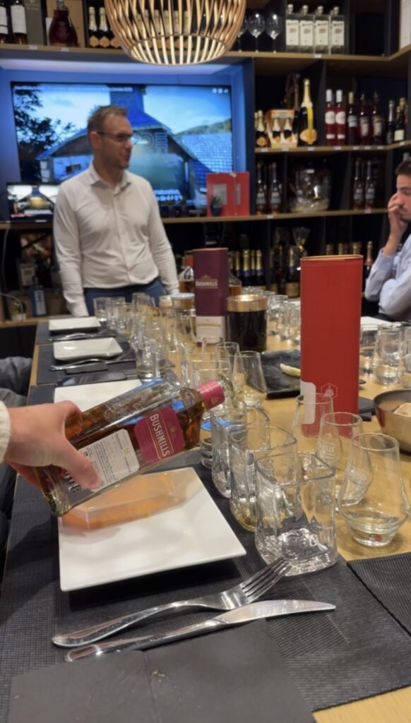 Saviez-vous que le whisky (écossais) et le whiskey (irlandais ou américain) se distinguent autant par leur orthographe que par leurs méthodes de distillation ? Lors de cette soirée, nos convives ont découvert ces nuances à travers six dégustations menées avec les prestigieuses maisons Bushmills et Bunnahabhain. Un voyage gustatif intense, entre douceur irlandaise et caractère écossais, qui a ravi les amateurs comme les curieux.